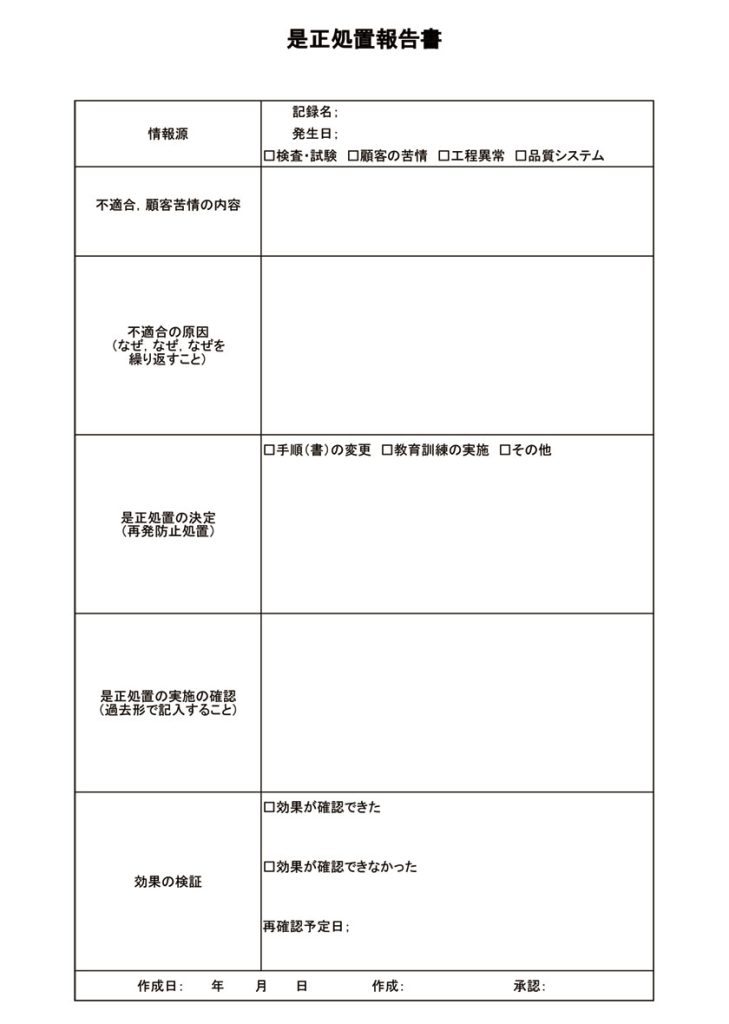 10-2 是正処置報告書 2023年11月20日 最終更新日時 : 2025年5月6日 admin ファイル形式Excel説明再発防止処置の記録 ISO14001に基づく是正処置報告書の書式です。記入例付きです。Excel版ですので会社の状況に合わせて修正可能です。 10-2 是正処置報告書 1 ファイル 15.43 KB ダウンロード 無料会員登録はこちらから 登録後、書式を無制限でダウンロードできます。